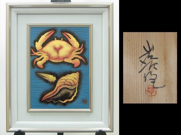 - 【心庵】額装 輪島塗巨匠 角野岩次「蟹と貝沈金壁面」/パネル 共箱 日展内閣総理大臣賞 A430