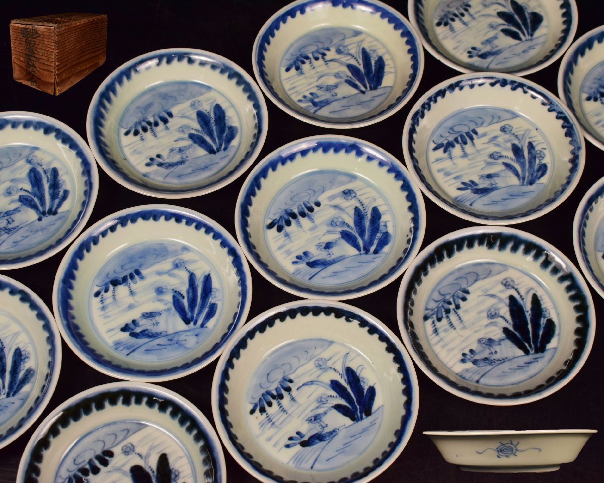 U542 【泉美】染付 丸皿 13客 懐石道具 木箱入拍卖