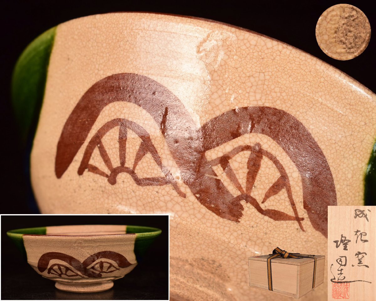 U825 【泉美】近藤隆司作 織部 波車 平茶碗 抹茶碗 茶道具 共箱入拍卖