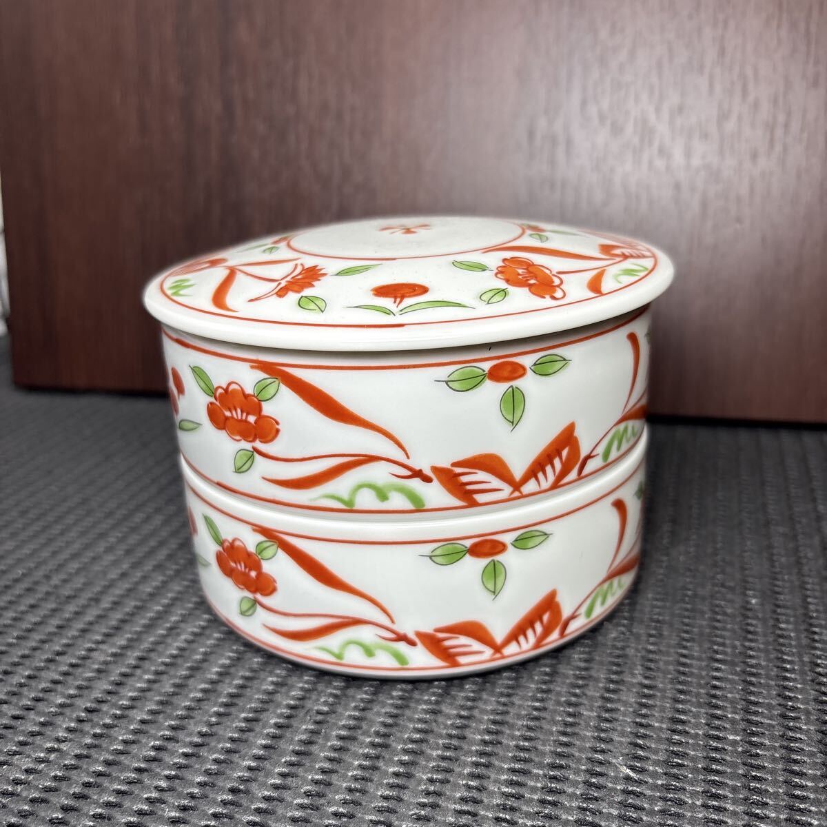 > ★大阪/店舗受け取り可★たち吉 二段重ね 二段重 小物入れ 蓋付き 陶器 赤絵 花文 橘吉印 和食器 小鉢 菓子入れ 小物入れ★