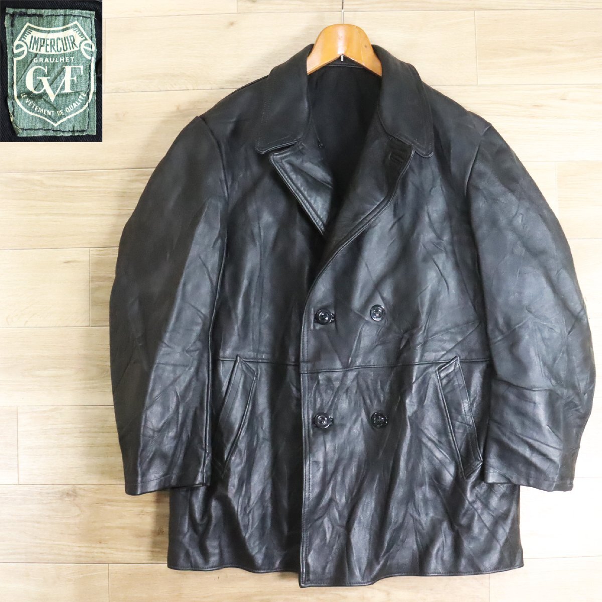 > Y3S/Y5.1-4 70s ビンテージ フランス GVF ダブルブレスト レザーカーコート 本革 レザージャケット フレンチ ヴィンテージ