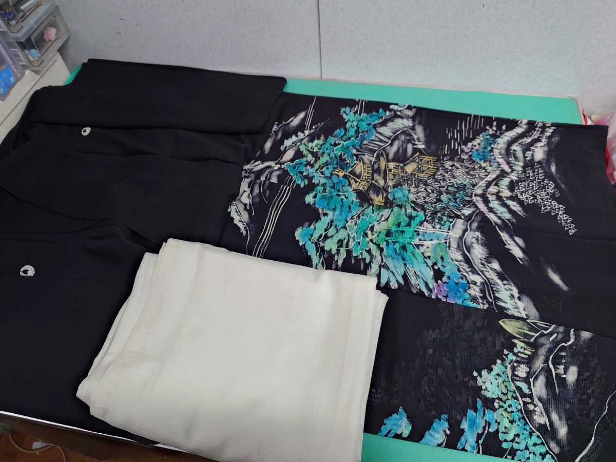- ●199 絽 五つ紋 夏 黒留袖 銀 駒刺繍 大胆なタッチ 金閣寺 山水 松 竹 柄 高級 正絹 着物 黒地 エメラルドグリーン パープル ④