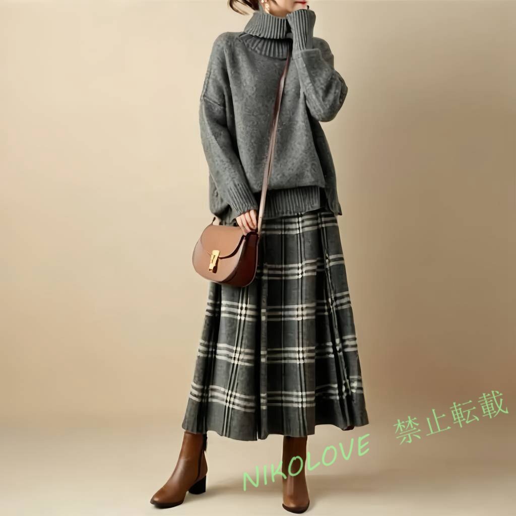 - 新品 秋冬レディース きれいめ セットアップ チェック柄 ロングスカート ニット ハイネック ニット セーター フレアスカート
