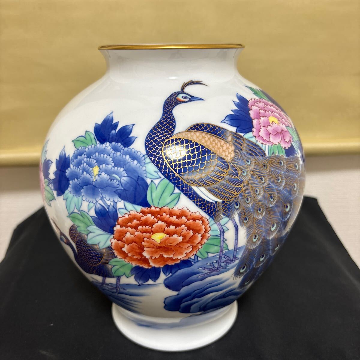 - 有田焼 香蘭社 色絵 染錦花鳥図 孔雀 牡丹 花瓶 花入 花器