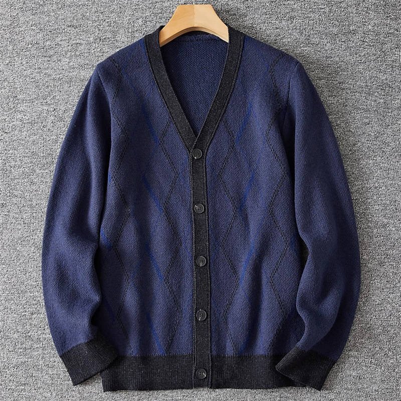 > 高級 国内未販売 新品 カーディガン 厚手 極暖 秋冬 メンズ ヴィンテージ ダイヤ柄 ジャガード ニット 柔らかい セーター 紺 T7106-XL