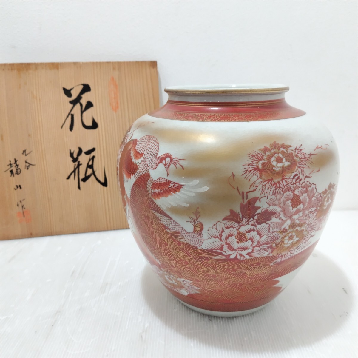 > D(1105i1) 九谷焼 花瓶 龍山 赤絵 金彩 牡丹 孔雀 花器 花入 花生 陶器 壺 陶芸 工芸品 木箱入り