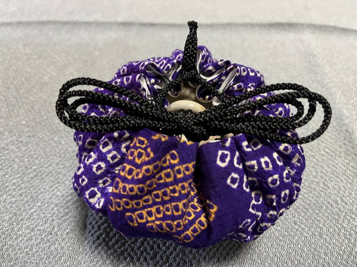- 手作り茶道具 ☆御物袋 ごもつ 御仕覆 お仕服 おしふく ☆正絹 鹿の子絞り紫と黄 ぐるり25~28 煎茶器 急須 湯呑 香合