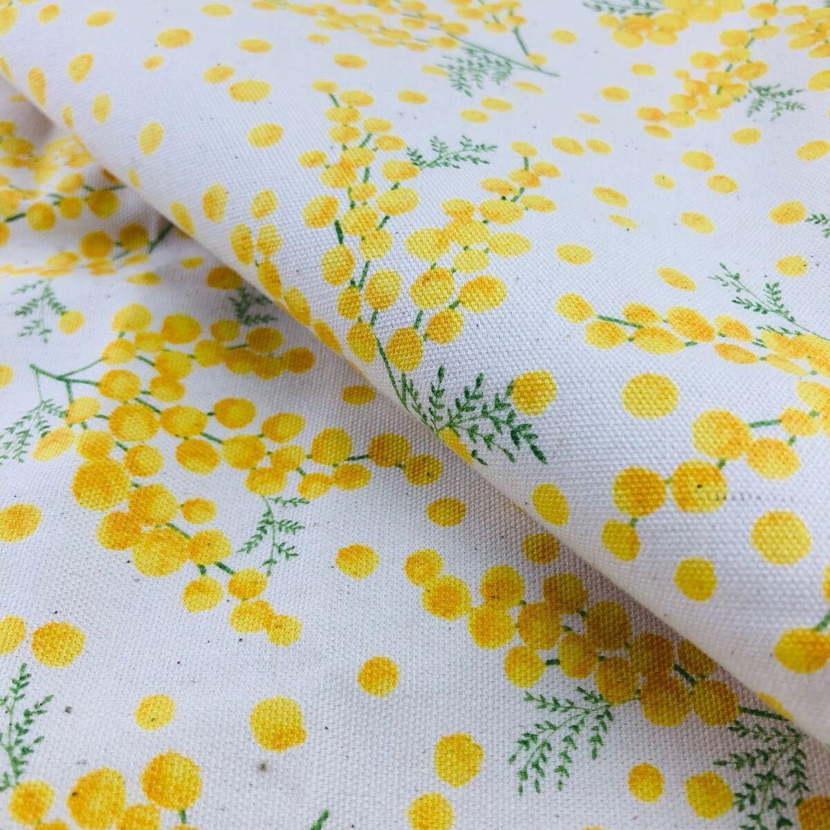 - 日本製 110×100 ミモザのオックス 生地 はぎれ 綿かす入り ミモザ柄 生成り