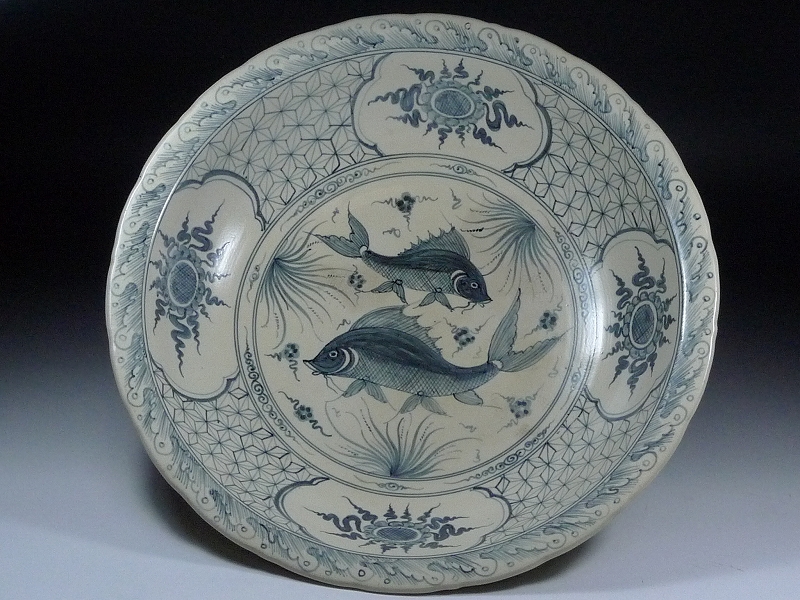 - 1006L01*11B▲中国美術 安南呉須染付魚藻文 大皿 直径約35.7㎝ 陶磁器 陶器 唐物 南蛮