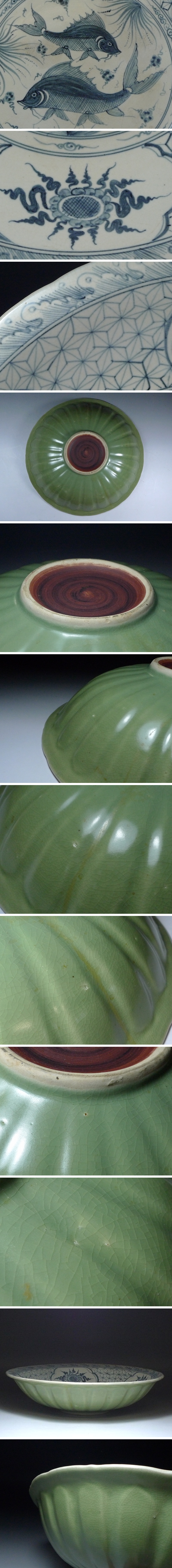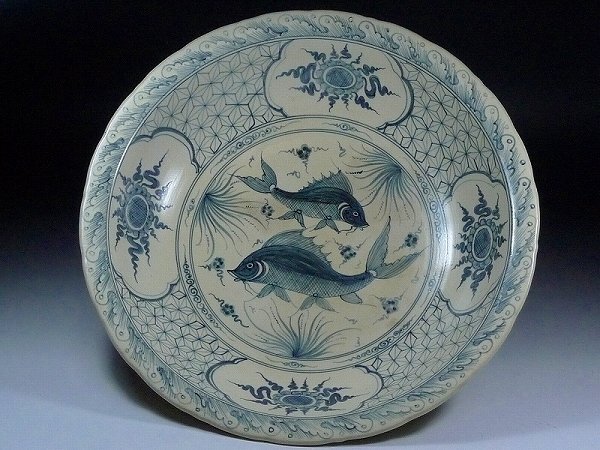 > 1006L01*11B▲中国美術 安南呉須染付魚藻文 大皿 直径約35.7㎝ 陶磁器 陶器 唐物 南蛮