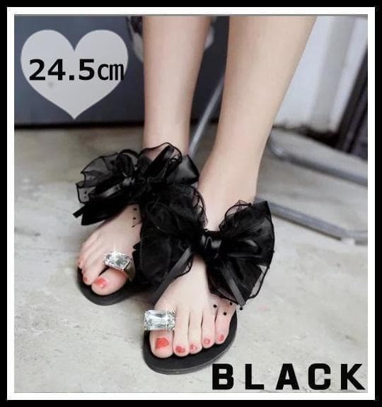 - ★ブラック 黒 ペタンコ サンダル フリル リボン ビジュー ドット 24.5㎝