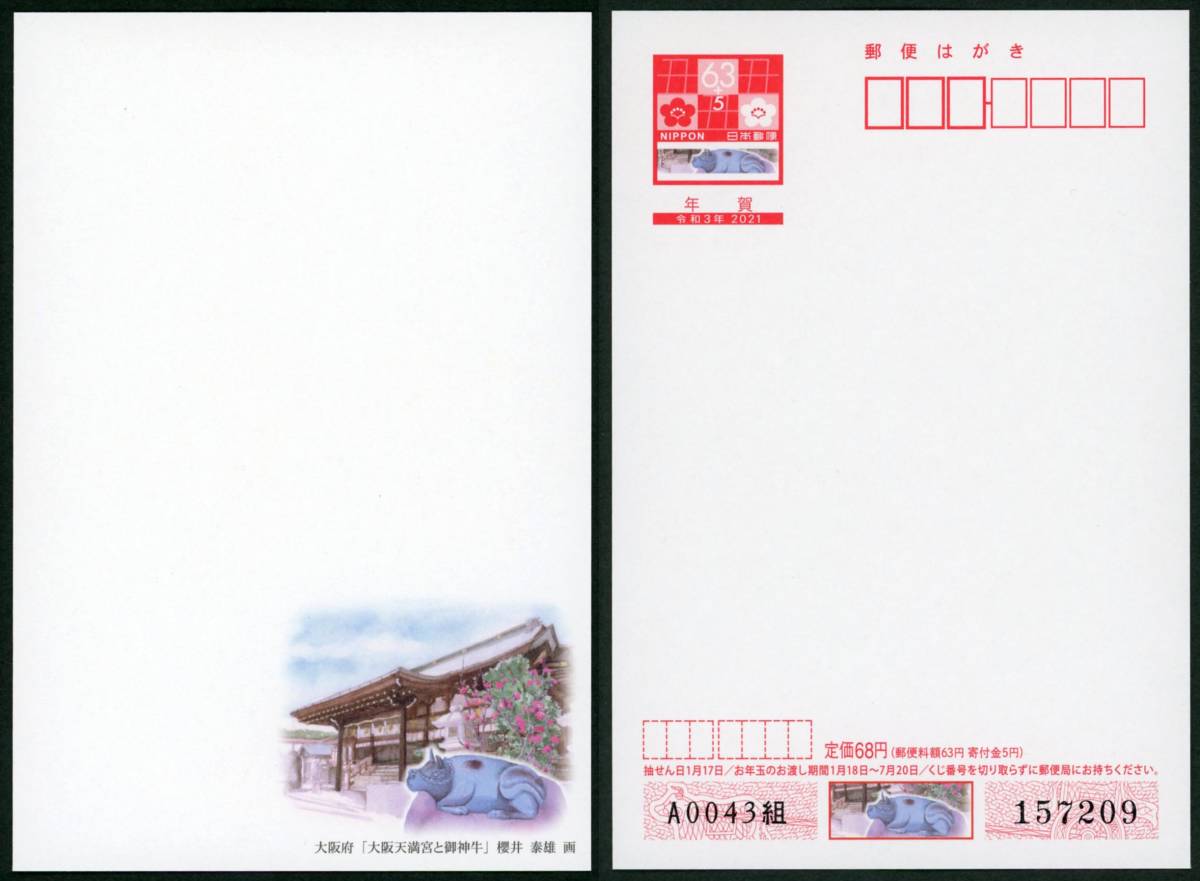 19410A7◆複数出品◆2021年用 大阪天満宮と御神牛63円★絵入り年賀はがき 大阪府 令和3年用