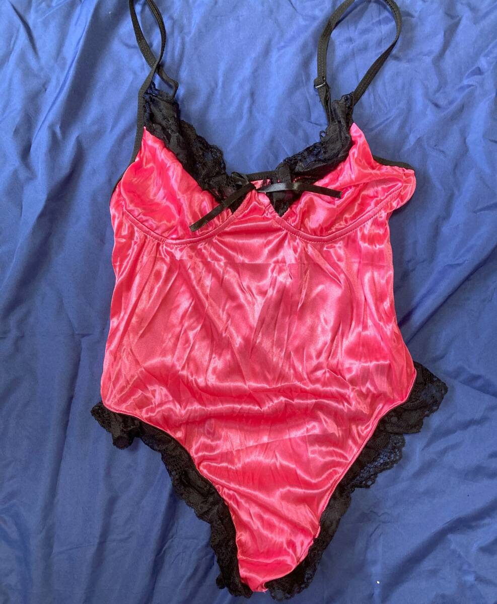 - Lサイズ/ ローズPINK 肩ショルダータイプ テディフリルレース付きクローズクロッチ ボディスーツ サテン光沢 つるつる薄手のお品 ナイロン