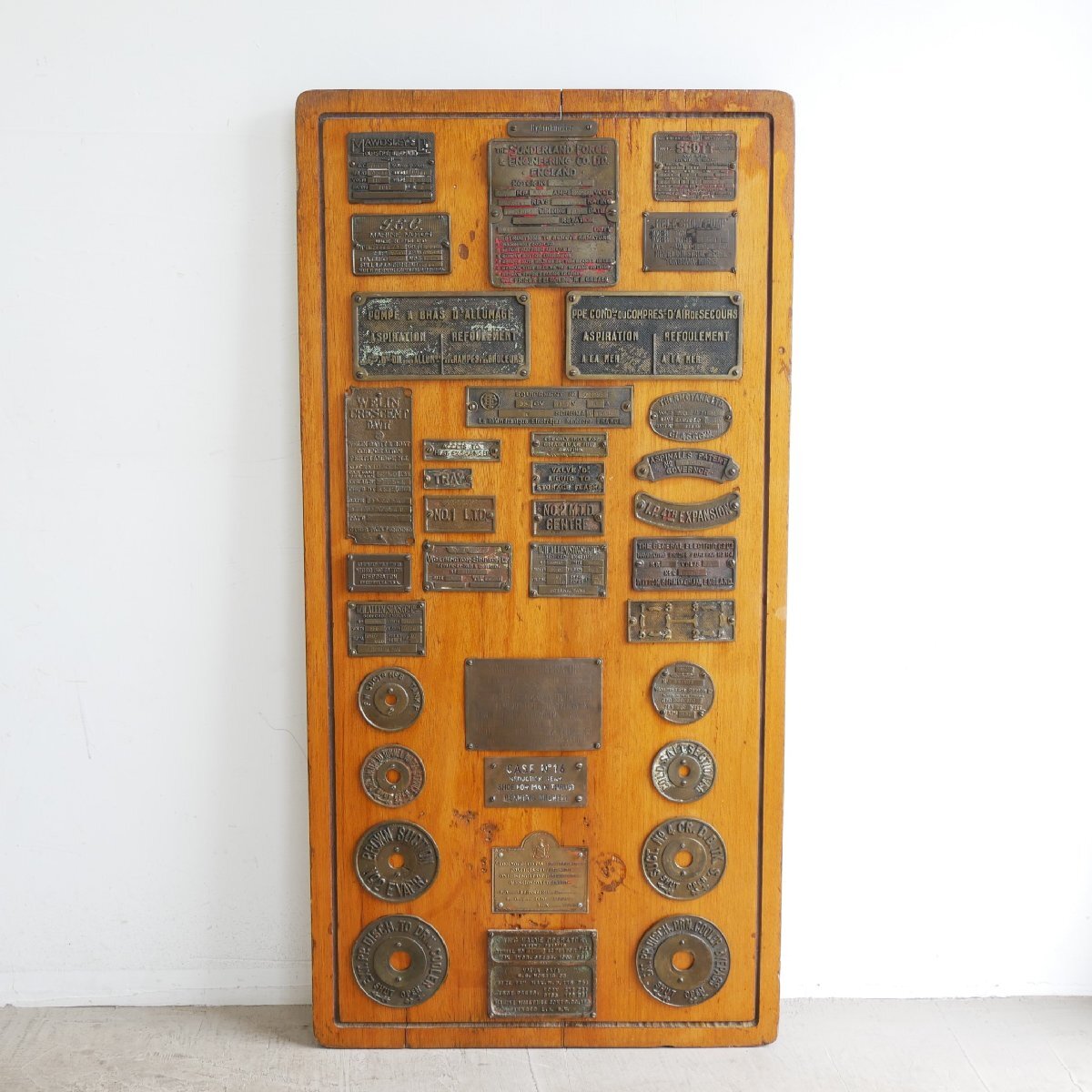 - アメリカ アンティーク 企業プレート 額装 / 金属製 37枚 エンボス文字 装飾 メダル ディスプレイ小物 #602-200-38-377