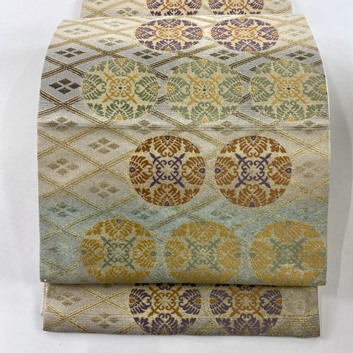 - 袋帯 名品 浮線綾文 斜め格子 金糸 箔 金色 六通 正絹 【中古】