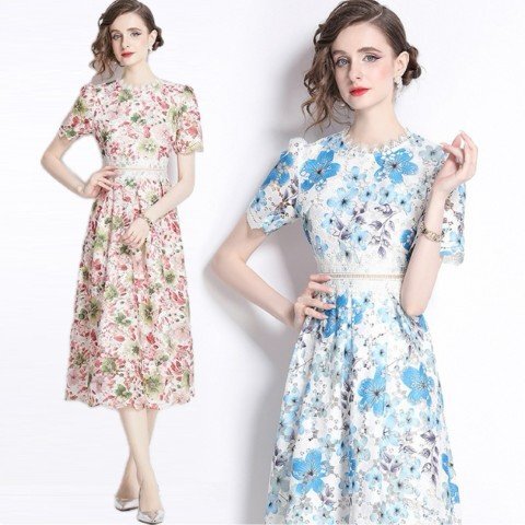 - パーティー 結婚式 お出かけ 360度綺麗 花柄ケミカル総レースドレスワンピース L ブルー