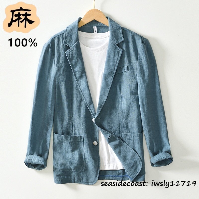 - 超希少*テーラードジャケット メンズ 春夏秋 リネンジャケット 麻100% 無地 清涼感 通気性 ブレザー 麻スーツ 紳士服 鮮やか ブルー L