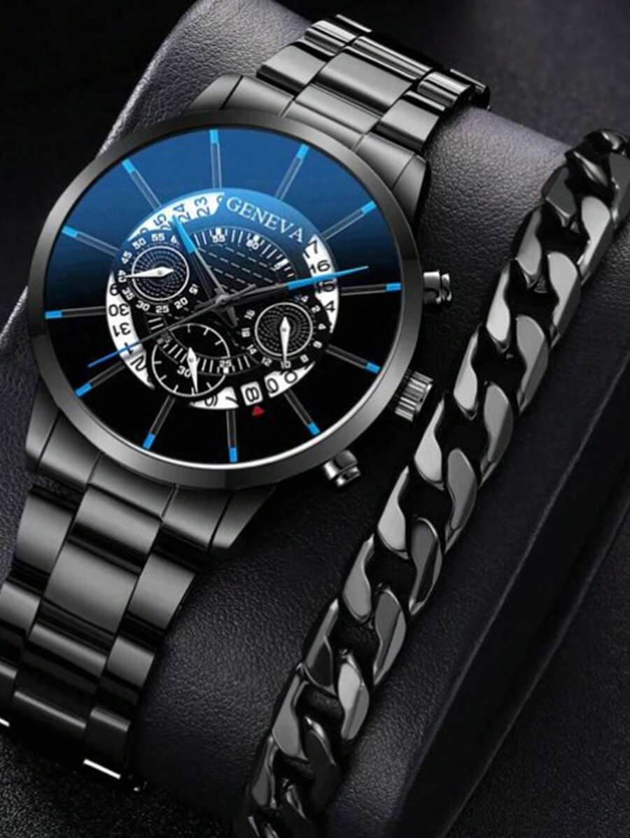 - 腕時計 メンズ クォーツ ビジネス用腕時計 カレンダー クオーツ ブラック ステンレススチール ブレスレット セット