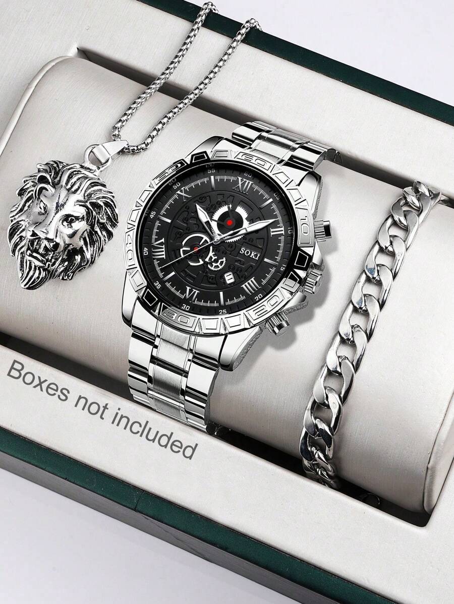 > 腕時計 メンズ セット ビジネス、ファッション、カレンダー機能付き、調整可能なステンレススチールバンド メンズウォッチ、ネックレス