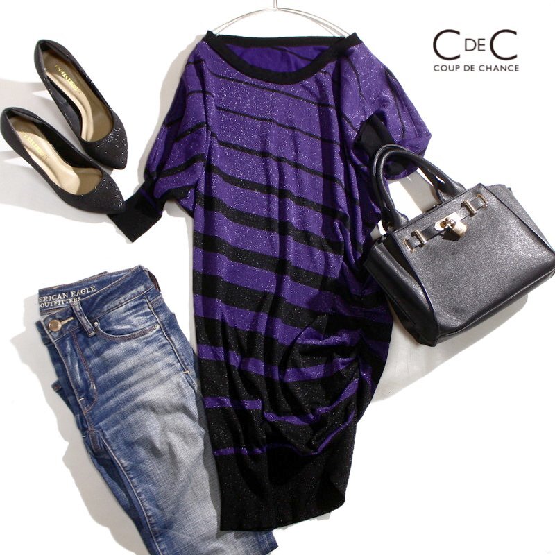 > 美品 クードシャンス COUP DE CHANCE 株) ワールド 秋 冬ドルマンニット ワンピース 9号 38 ラメ ボーダー パープル 紫 ブラック 黒 タイト