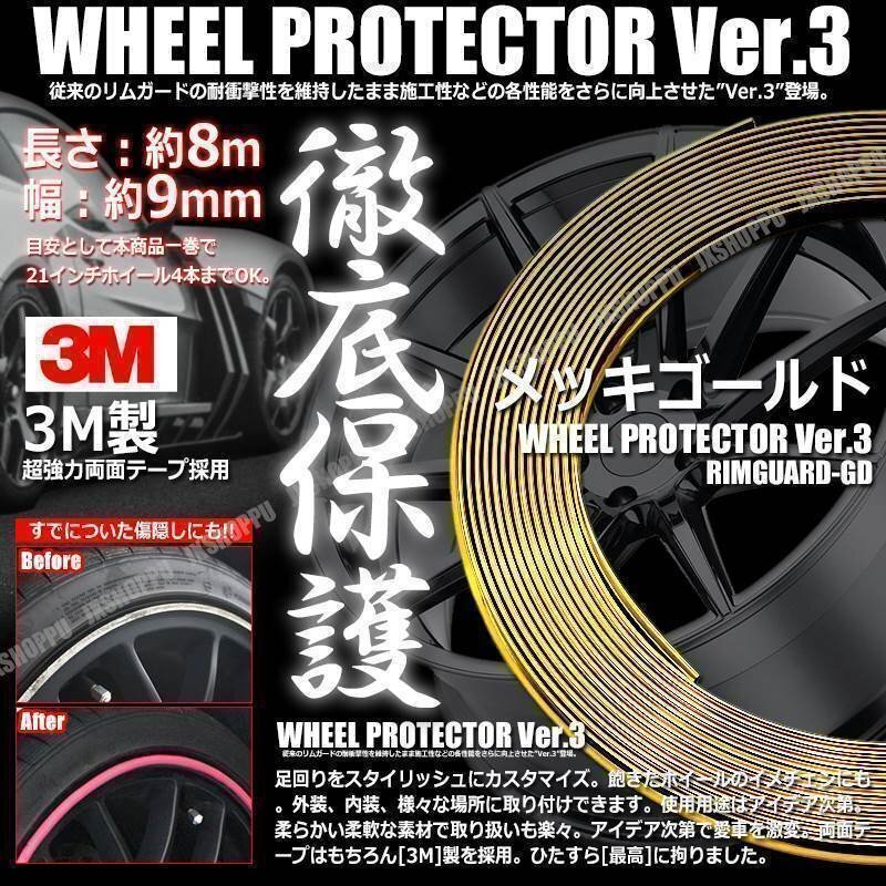 > 送料0円 特注 ホイールリムガード 長さ8m 幅9mm [メッキゴールド] 3M製両面テープ リム プロテクター ガード ラインモール 外装 汎用 車