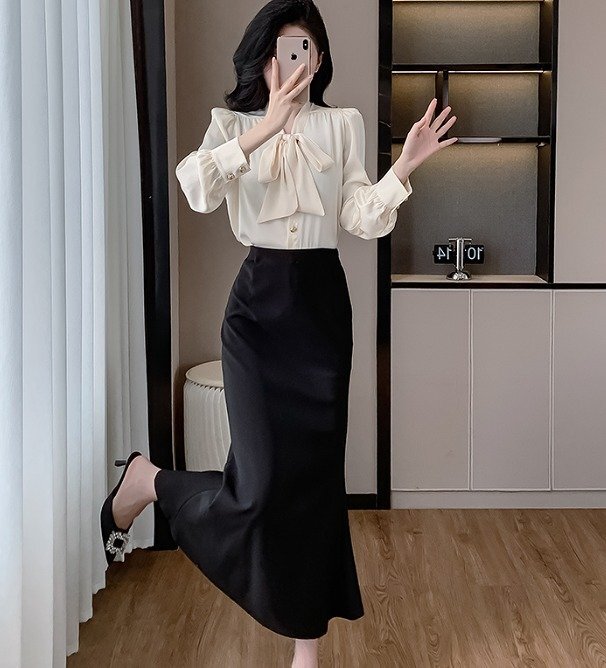 - 上下セット 長袖トップス ロングスカート リボン フリル きれいめ シンプル オフィス M ワンカラー