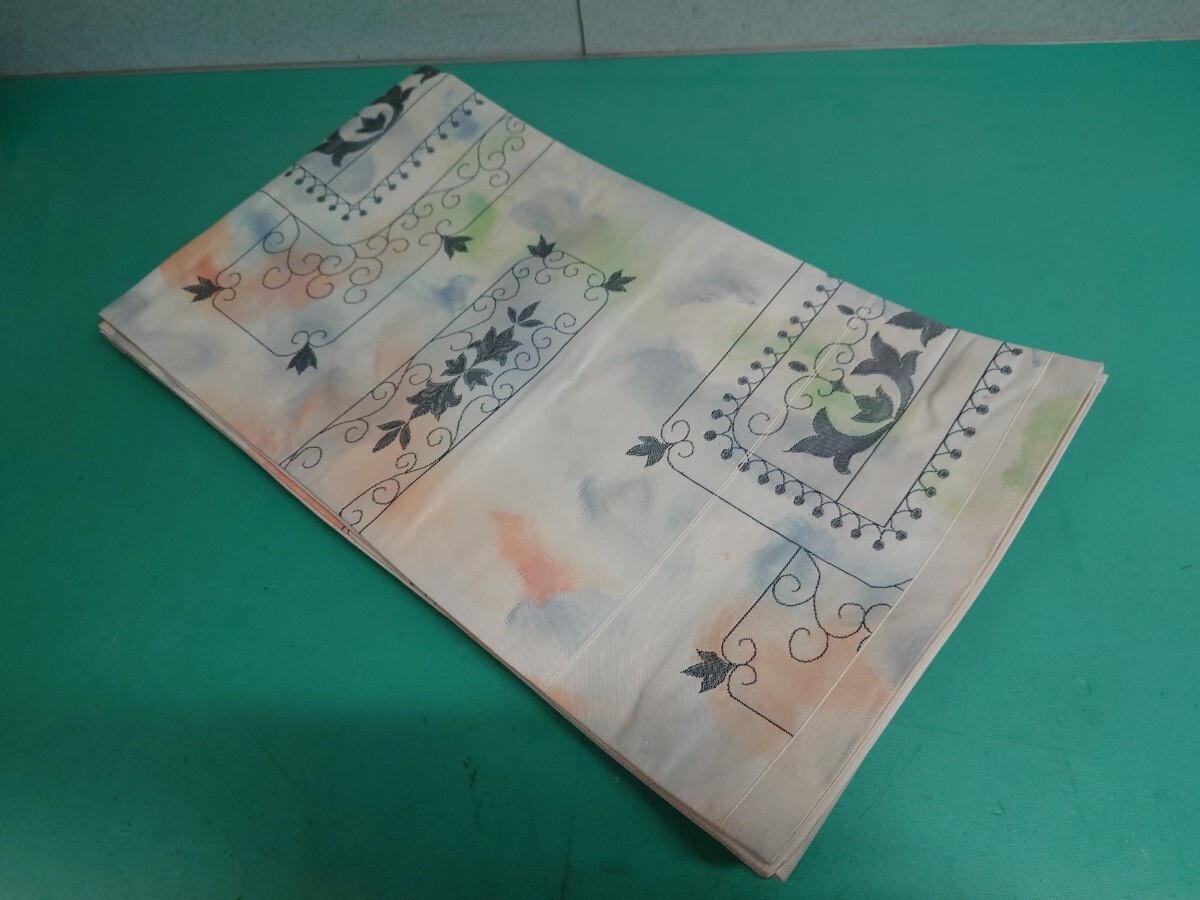 - ● 236 西陣 高級 袋帯 オリエンタル ヨーロピアン 水彩画のような 色合い オレンジ バープル グリーン ベージュ 素敵な 六通 帯 中古 ③