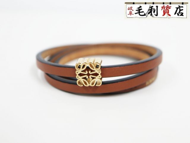 > ロエベ LOEWE アナグラム カーフレザー ブラウン ロゴ ゴールド サイズM ブレスレット ユニセックス 美品 アクセサリー