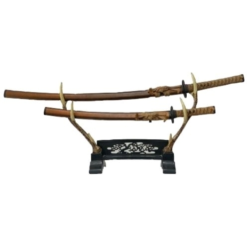 - 札17 模造刀 日本刀 刀掛け台付き 2本 大小 セット 武士 武具 刀剣 小道具 和風 茶色 アンティーク コレクション ジャンク