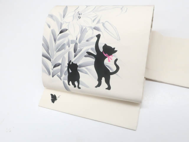 - 《古美術京松》九寸名古屋帯 オリジナル 落款入り お太鼓柄 猫 ネコ 蝶 正絹 r7b11-212