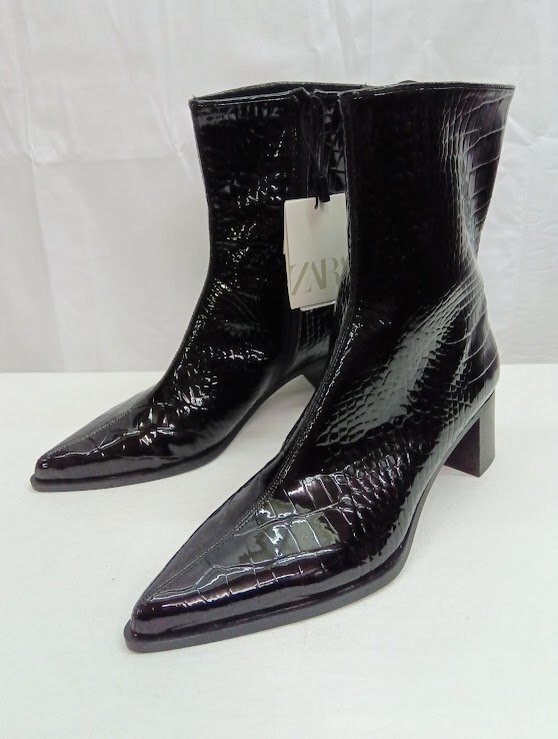 > 未使用★ZARA◎ザラ クロコダイル柄 アンクルブーツ 38(24.5)黒 ブラック エナメル 合成皮革 参考価格:6,590円 タグ付き 美品 新品