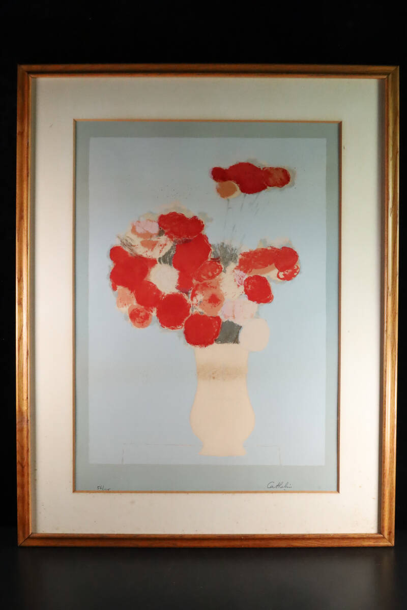 > ◇雅◇ 真作保証 ベルナール・カトラン「青い背景の赤い花束」 1976年 直筆サイン リトグラフ 20号 ED 56/125 静物画 C116.2-1RG.25.11.PU