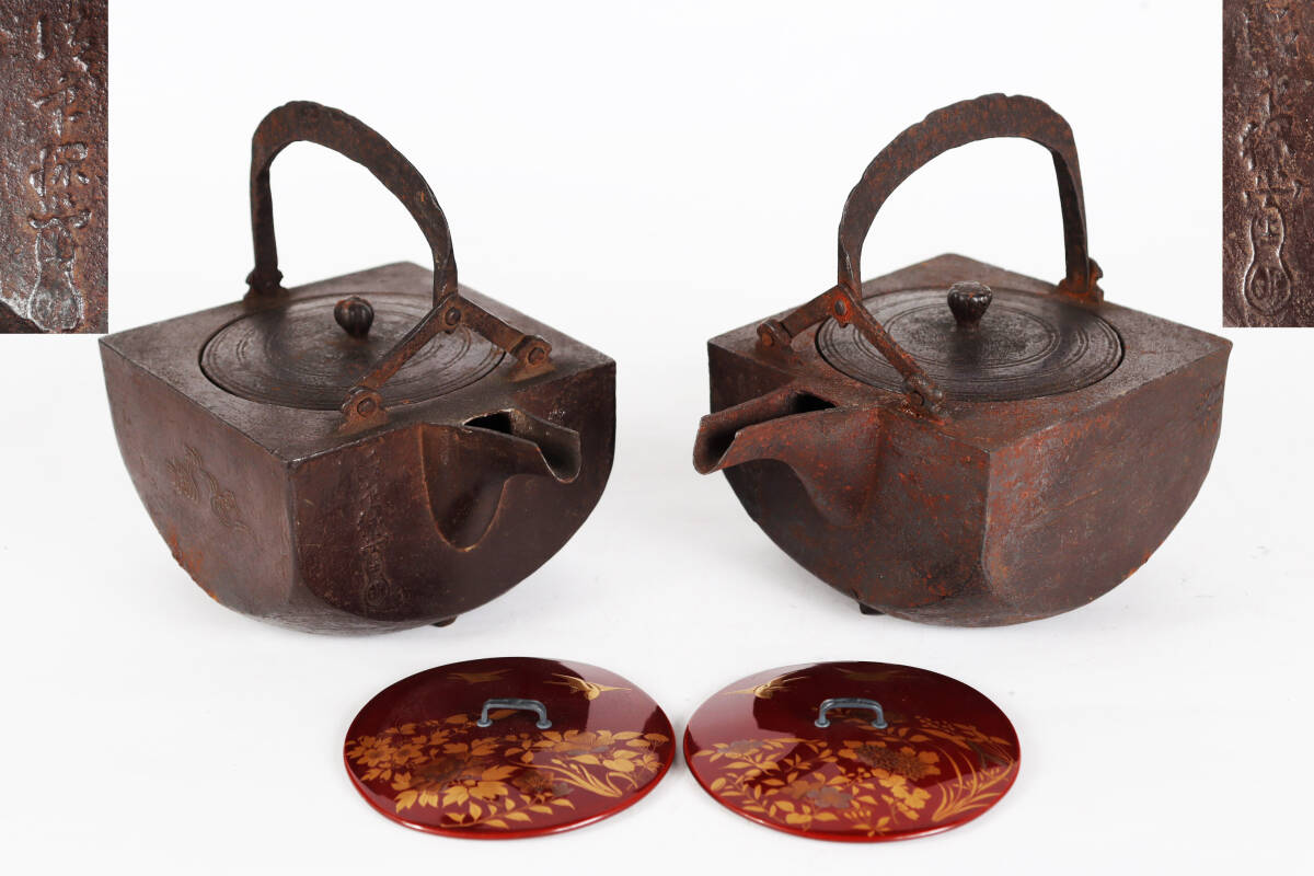 - 希少 釜師名人造 時代 狩野探幽法印守信 四方形銚子 一対 蒔絵替蓋(燗鍋酒器鉄瓶茶道煎茶) F7