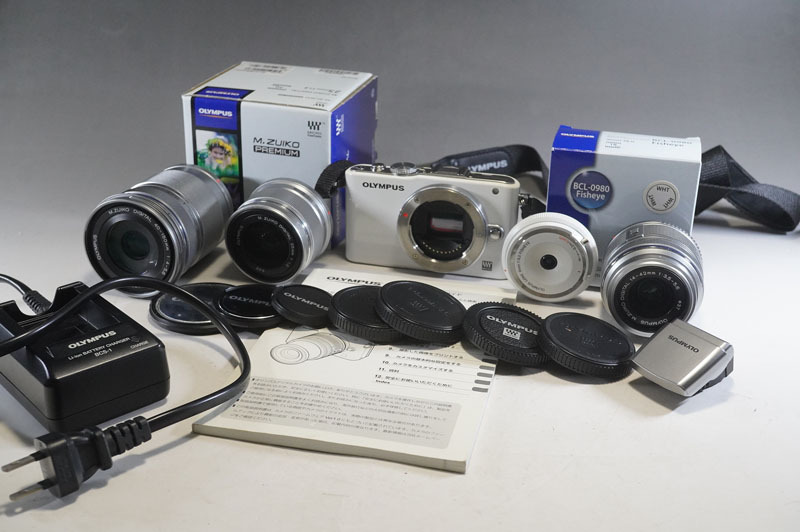 > 1円~【L897】OLYMPUS PEN Lite E-PL3 オリンパス /M.ZUIKO 40-150mm 1:4-5.6 /14-42mm 1:3.5-5.6 /25mm 1:1.8 FISHEYE・バッテリー・充電器