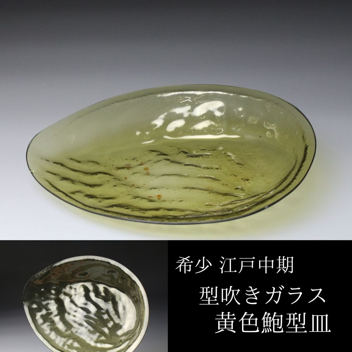 - 【LIG】希少 江戸中期 型吹きガラス 黄色鮑型皿 向付 江戸硝子 ギヤマン びいどろ コレクター収蔵品 [.WQ]25.10
