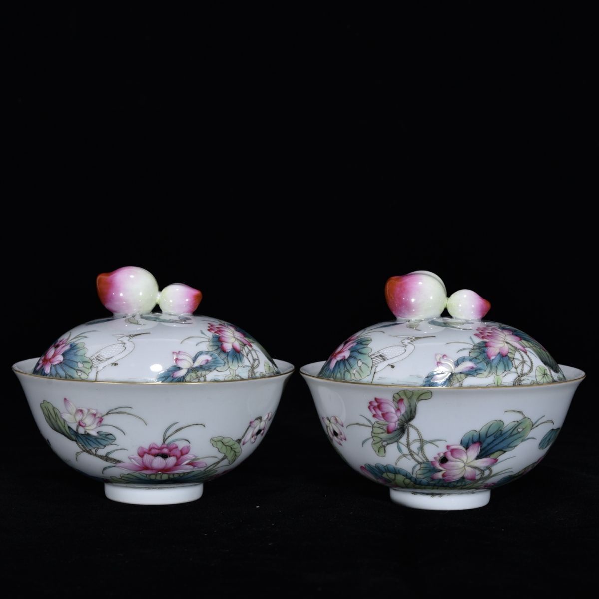 - 永し 清時代 乾隆年製 粉彩 鴛鴦荷花紋蓋碗 一対 古陶磁器 陶芸 皿 中国陶瓷器 唐瓷 置物擺件 古美術品 古賞物 収集 旧家蔵出 中国唐物 A21