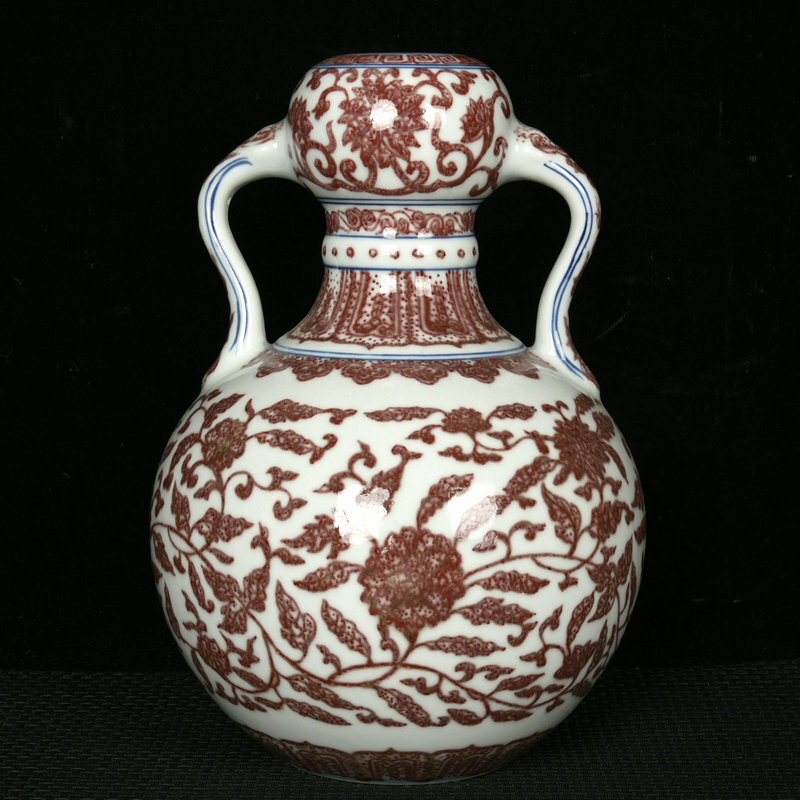 - 『清・乾隆年製款・古陶瓷品・釉里紅・纏枝花紋・如意蒜頭瓶・染付・唐物』極細工 置物古賞物 中国古玩 中国古美術