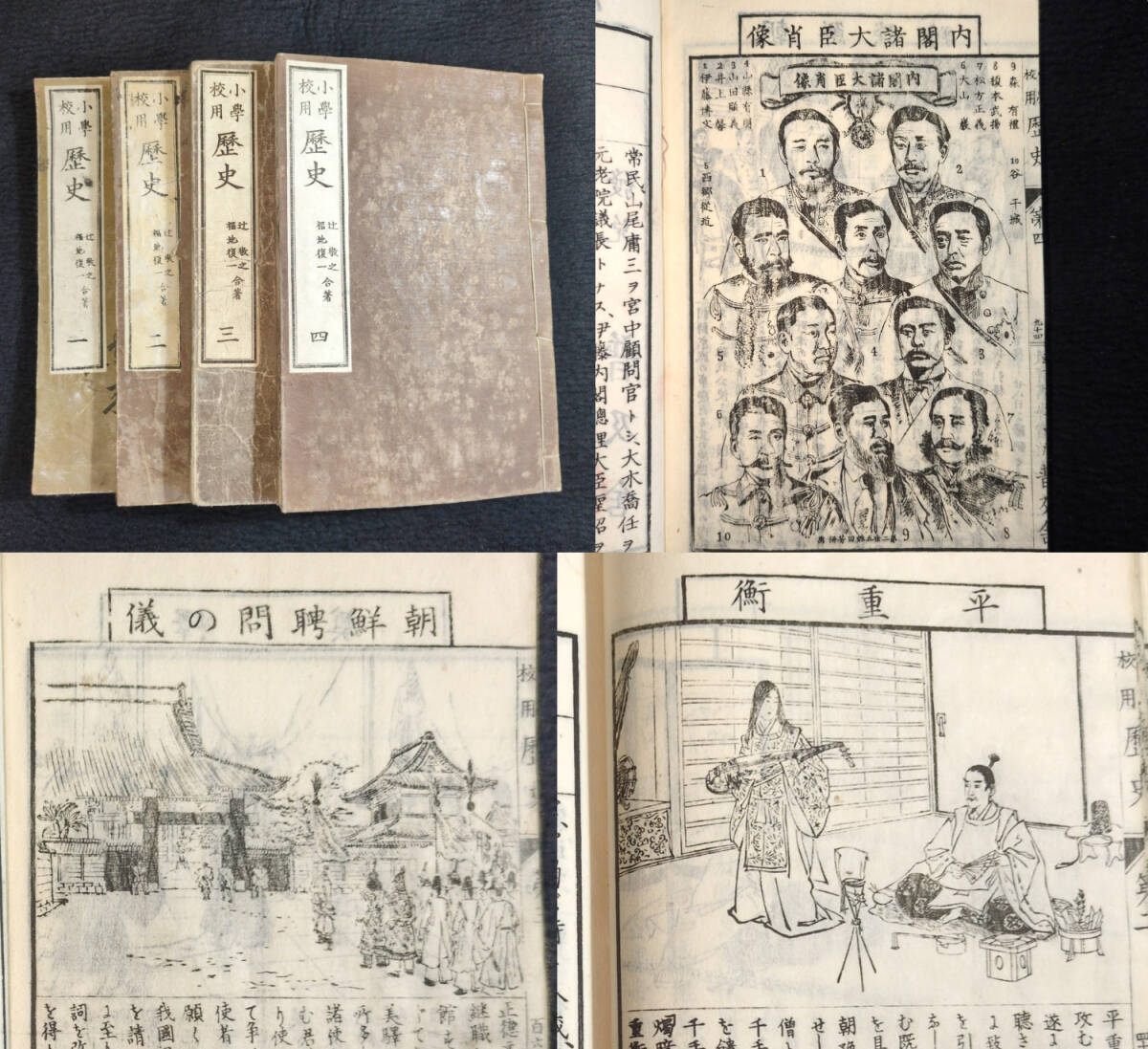 - Y647 絵入◆小学校用 歴史◆全4巻4冊揃 日本史 明治維新 大臣肖像入 教科書 明治時代物 浮世絵UKIYOE 木版画 骨董 古美術 古文書 和本 古書