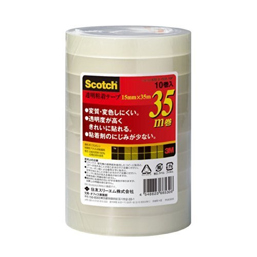 ブランド:スリーエム(3M)カラー:透明サイズ:幅15mmx35m巻・変質・変色しにくい透明テープです。・粘着剤のにじみが少なく、きれいに貼れます。15mm×35m,入り数:10巻/1パック,巻芯径:76mm