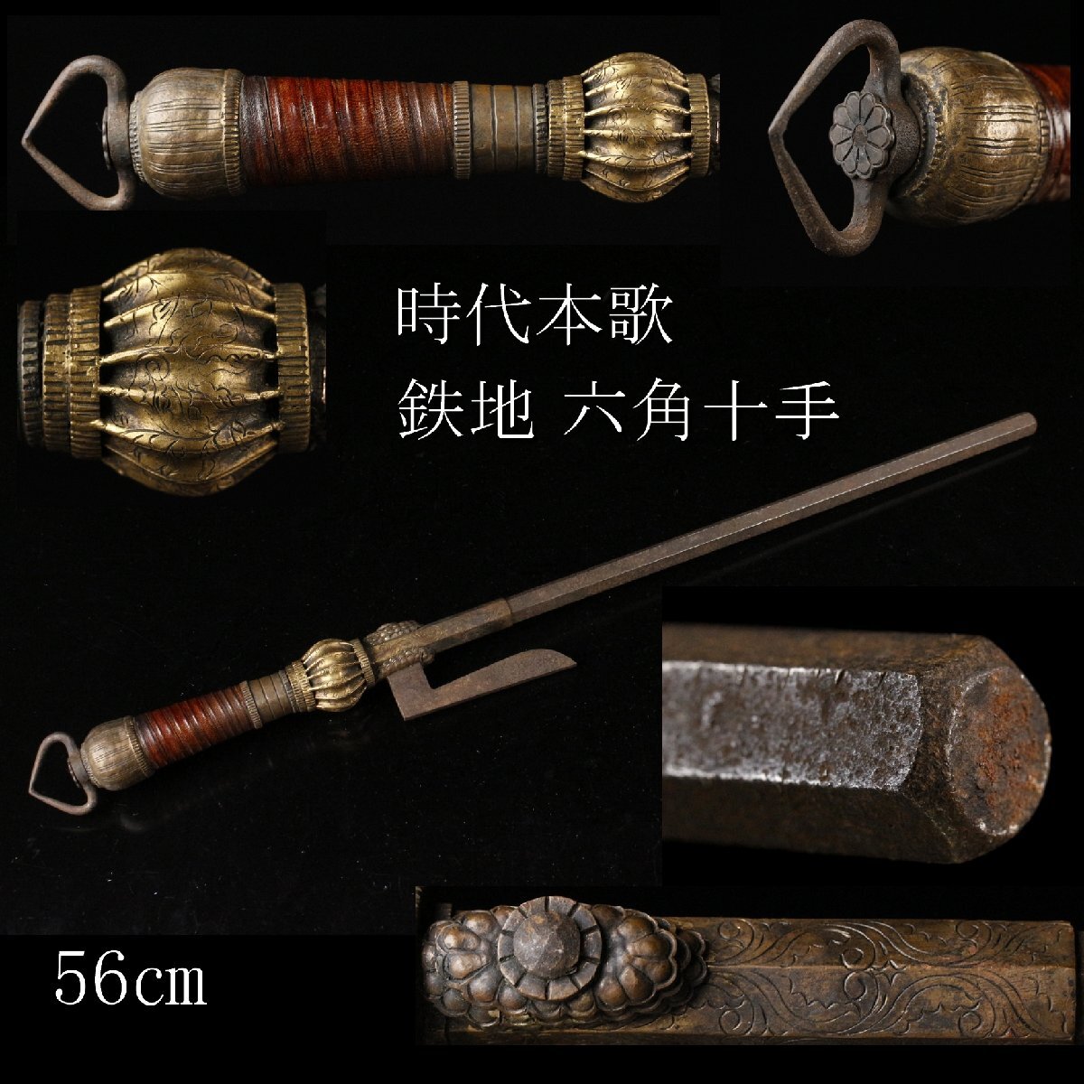 > 【LIG】時代本歌 鉄地 六角十手 56㎝ 菊花彫金細工 刀装具 時代武具 コレクター収蔵品 [.YY]25.11