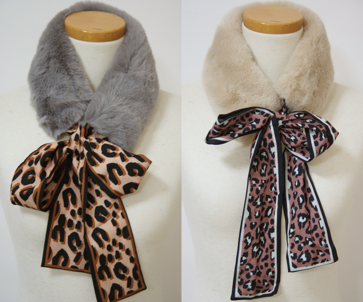- 送料無料◆超お得◆2色組◆エコファー◆襟元お洒落◆マフラー◆ミンクタッチ◆ヒョウ柄リボン◆ファーティペット(グレー&ベージュ)3755