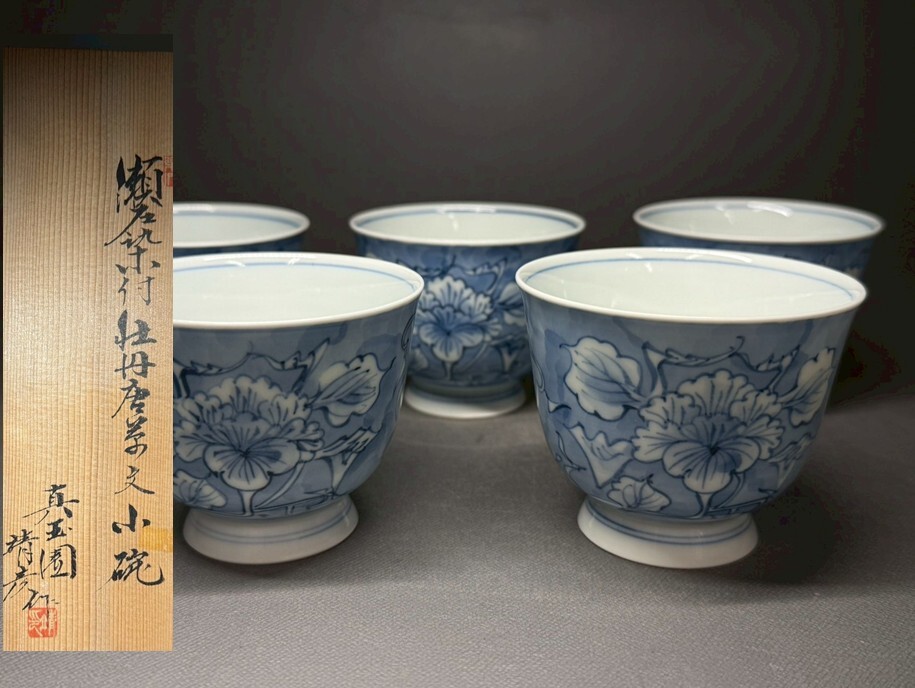 > 瀬戸染付 真玉園 加藤靖彦 牡丹唐菜文小碗 5客 骨董 置物 飾物 日本伝統工芸品 芸術 古美術 時代物 作家 在銘 落款 旧蔵出 初出18