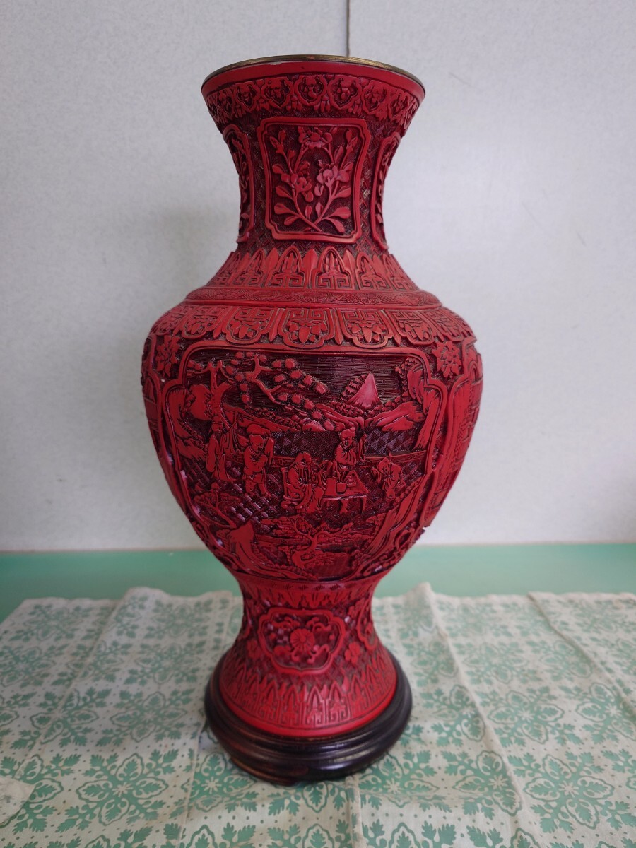 - ● 中国美術 堆朱 【楼閣山水文/花草文/人物】繊細 彫刻 花瓶 漆器 大きめ 51cm /4400g 骨董 古美術 ④