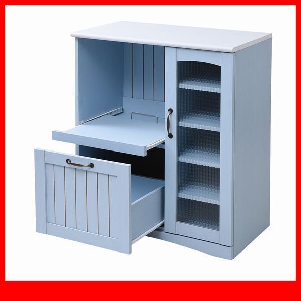 > レンジ台★フレンチカントリー/キッチンカウンター レンジ台/スライド棚 コンセント付 キッチン収納 ガラス扉 姫系/青 白/ffca-0005/zz