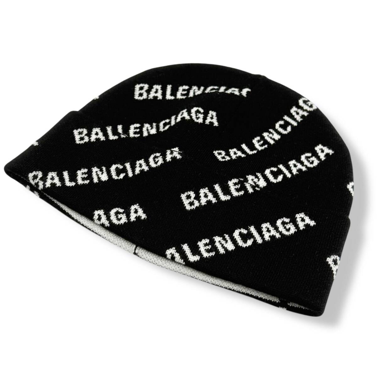 - 未使用 バレンシアガ ビーニー ブラック ロゴ ブラック BALENCIAGA 719580 ニット帽 帽子 総柄 メンズ レディース df2