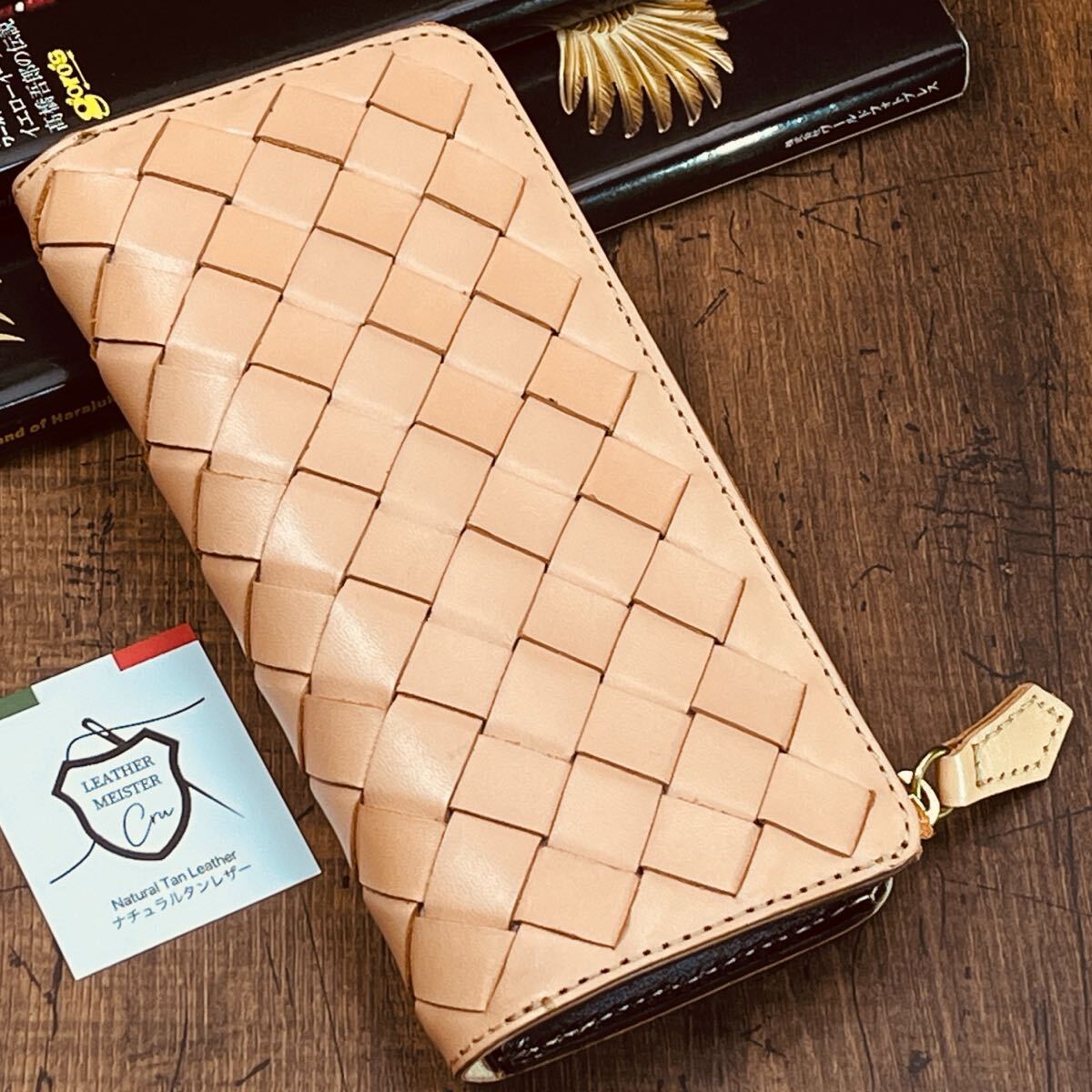 - L字ファスナー ナチュラルタンレザー ヌメ革 編み込み イントレチャート メンズ財布 長財布 本革 ハンドメイド 送料無料 新品 未使用 1円