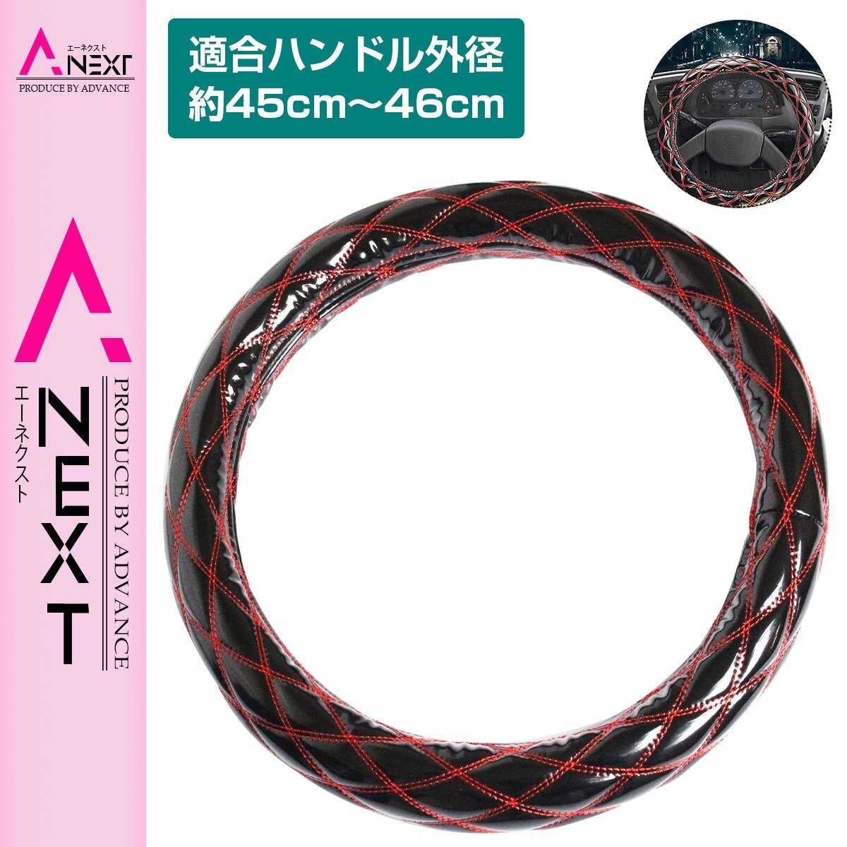 - 極太 太巻き エナメル ダブルステッチ ダイヤカット トラック ハンドルカバー 艶ブラック×レッド Lサイズ ふそう 4t ベストワンファイター