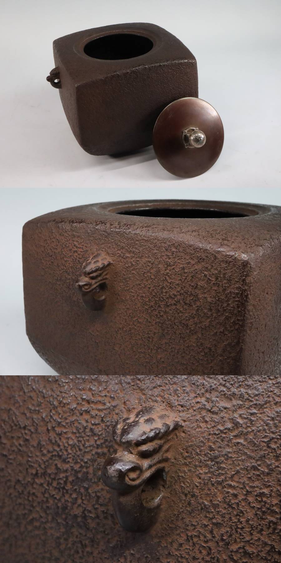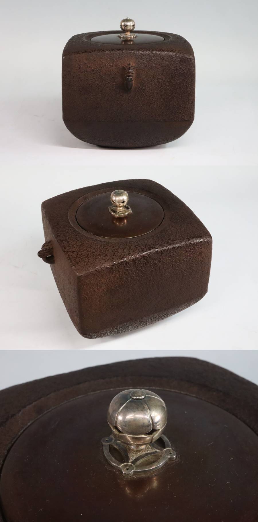 > ◇雅◇ 人間国宝 釜師 角谷一圭作 四方釜 銀摘 銅蓋 共箱 共布 茶道具 茶釜 /RYO.25.11 [C102] RV