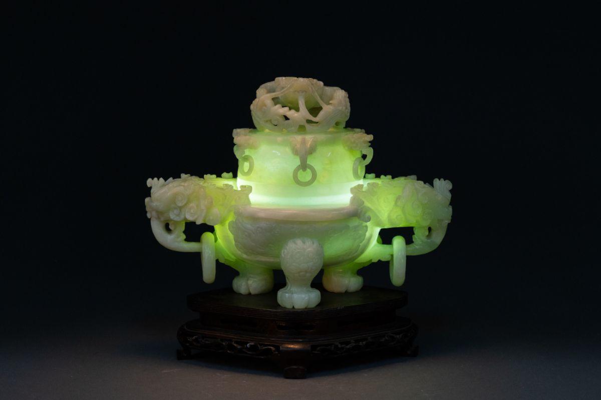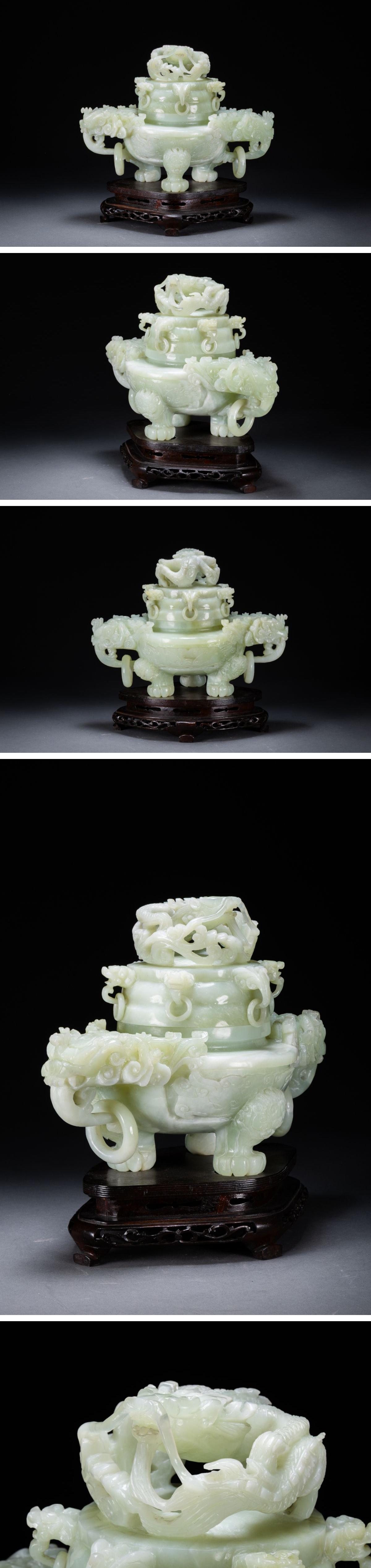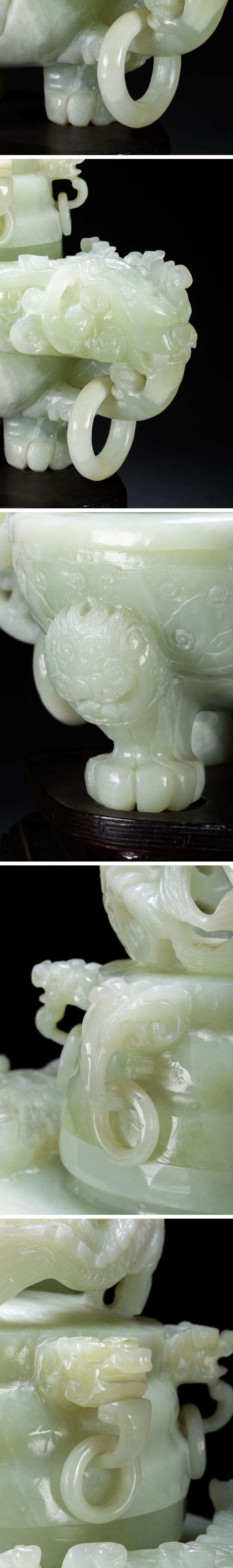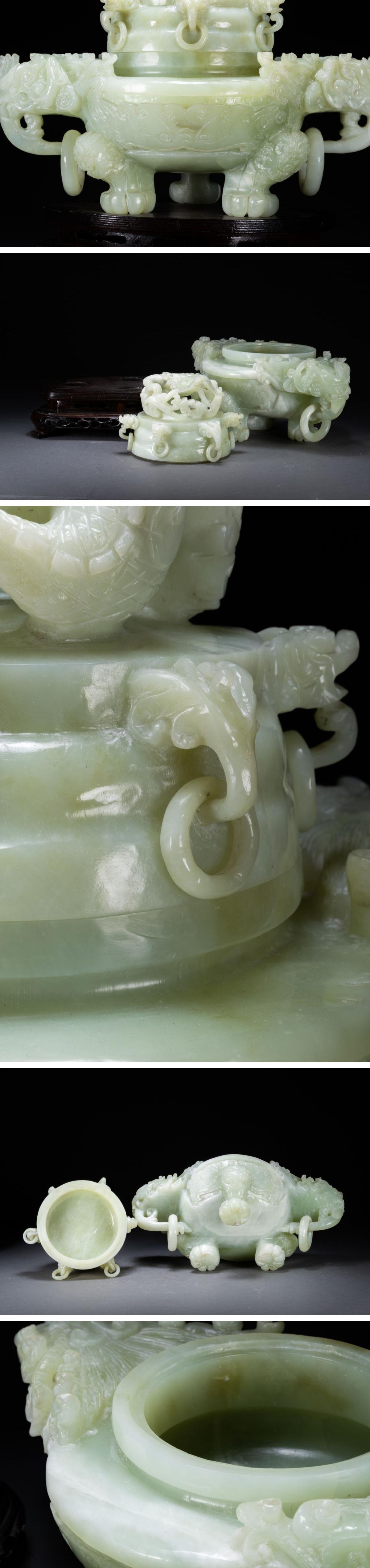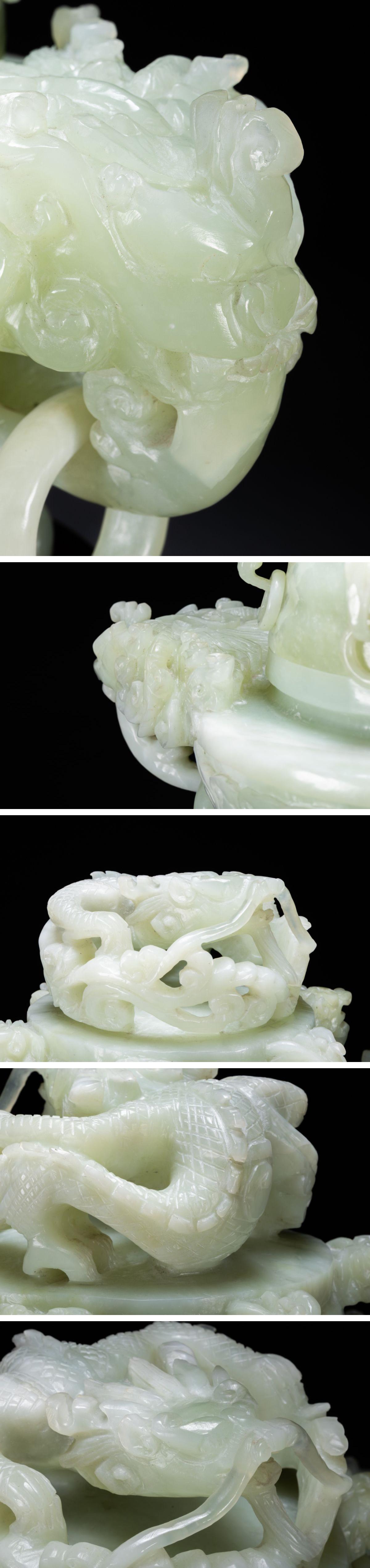 > 【雲錦】関西某オークション購入 中国・時代物 天然玉石 龍耳三足香爐9.4㎏ 極細工 古置物 古擺件 中国古美術74S-100