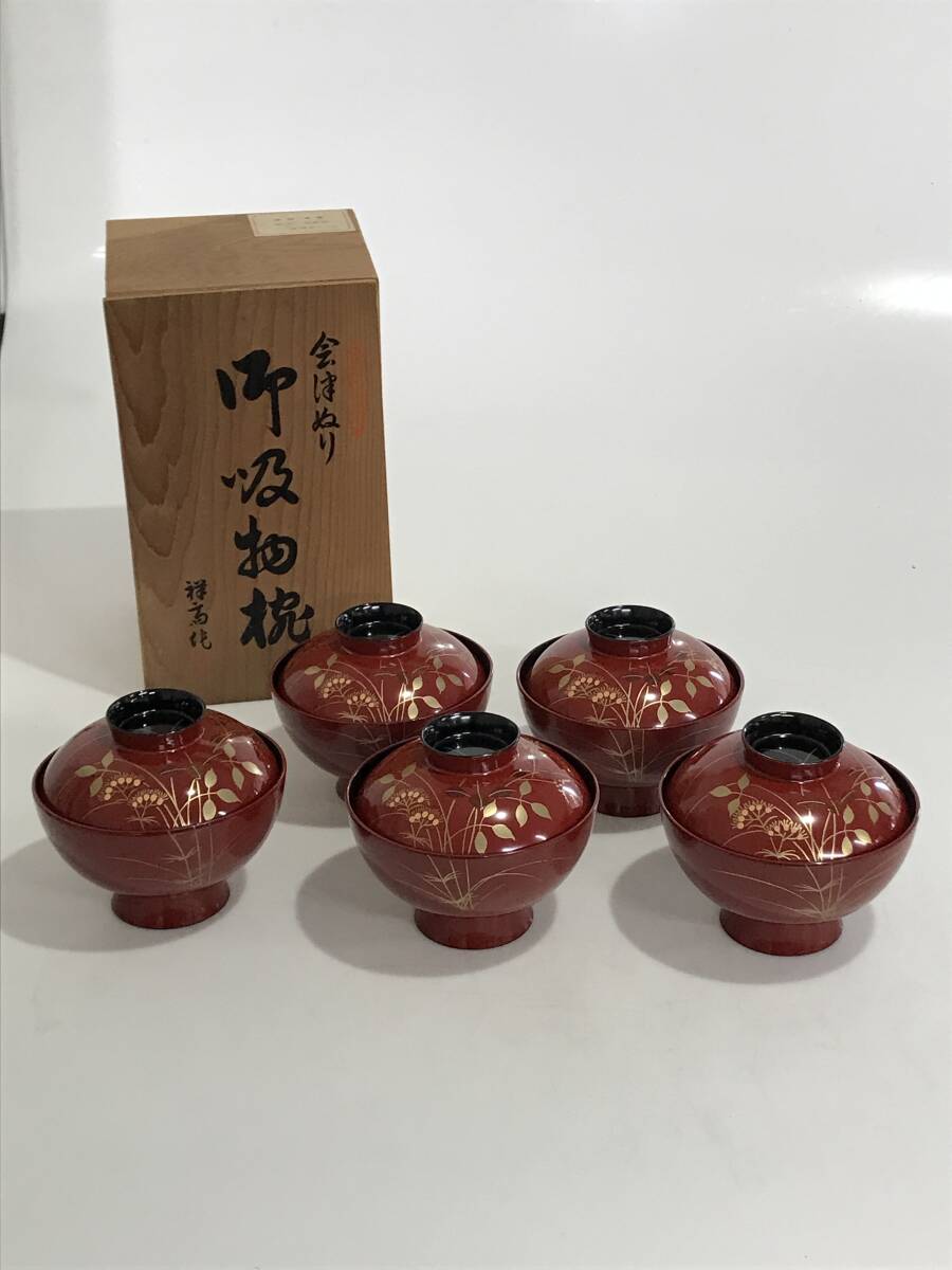 - HG9015 会津塗 吸物椀 蓋付椀 5客揃 朱 秋草 漆器 お椀 汁椀 和食器 木乾漆 伝統工芸品 紙箱